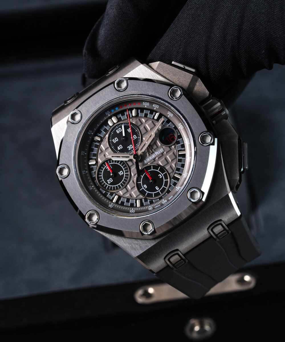 This Audemars Piguet Royal Oak Offshore 26568IM.OOA004CA.01 has a Grey dial and a Rubber strap.