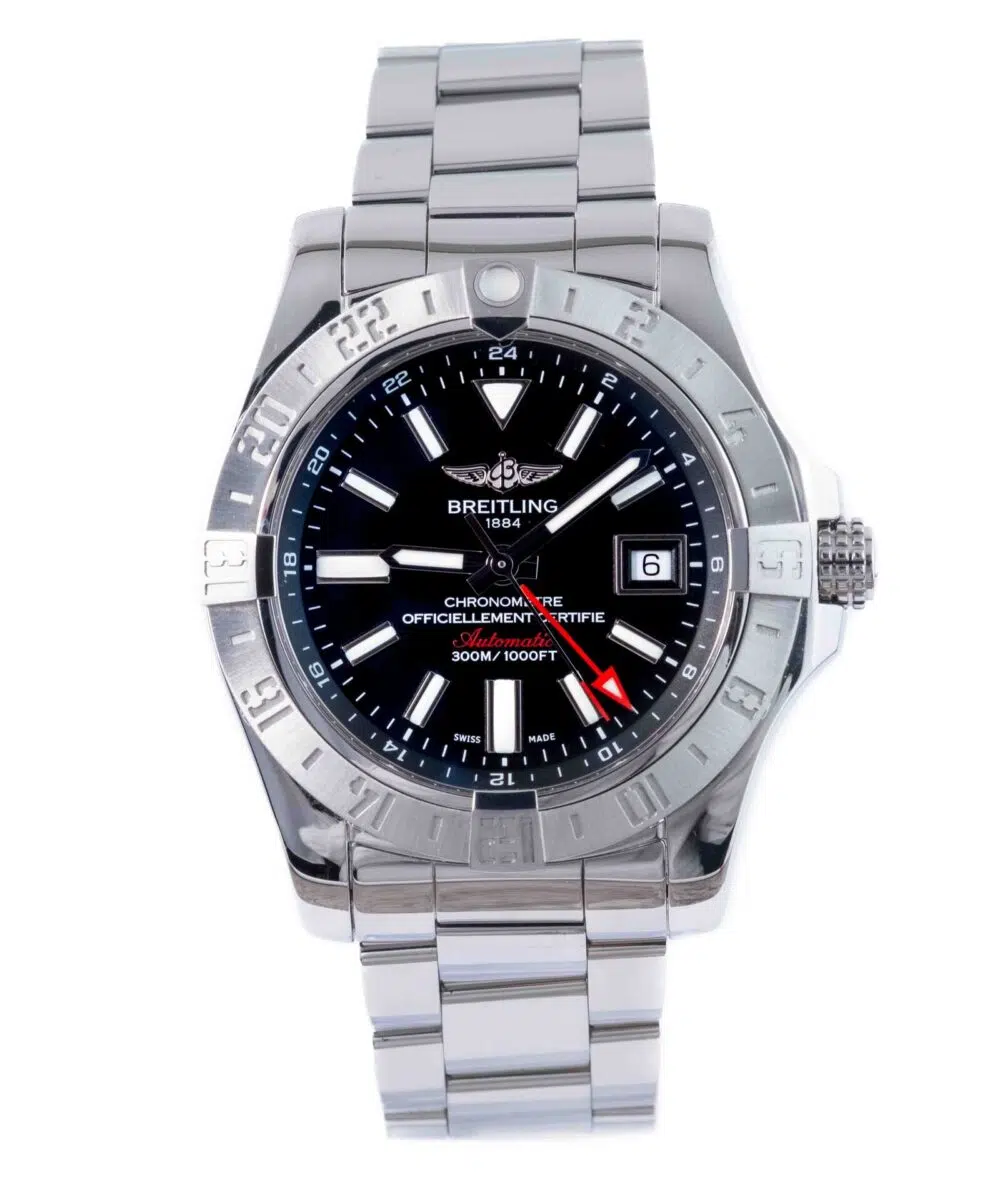 This Breitling Avenger II GMT A3239011 has a Black dial and a Bracelet strap.