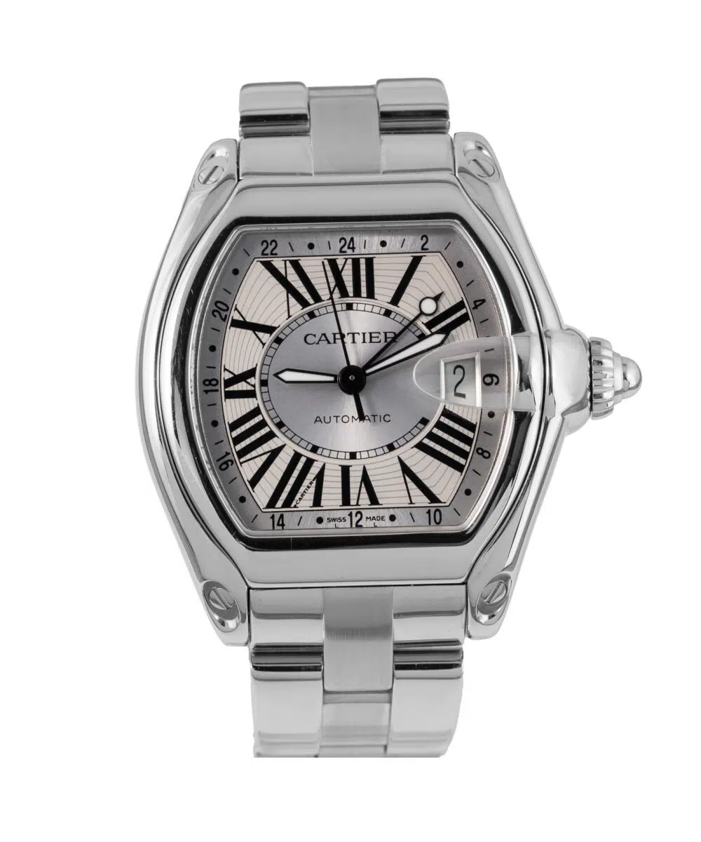 This Cartier Roadster 2722 has a Silver dial and a Bracelet strap.