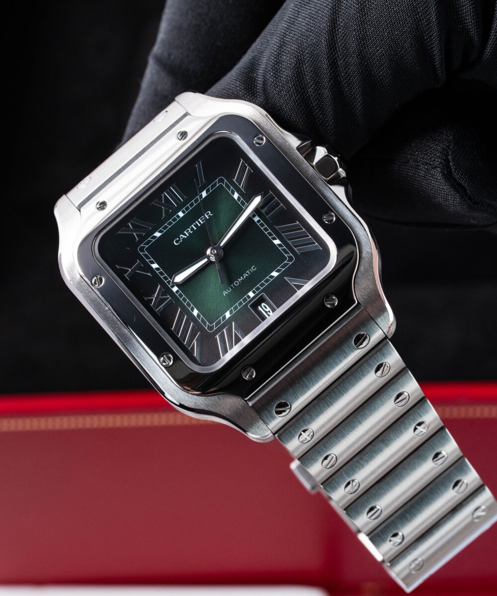 This Cartier Santos De Cartier WSSA0062 has a Green dial and a Bracelet strap.