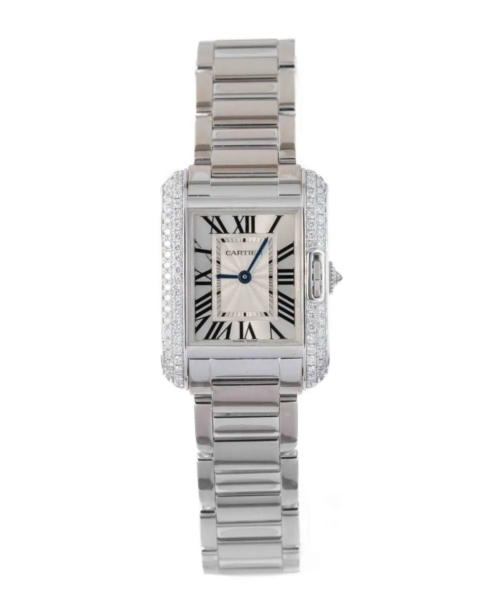 This Cartier Tank Anglaise WT100008 has a Silver dial and a Bracelet strap.