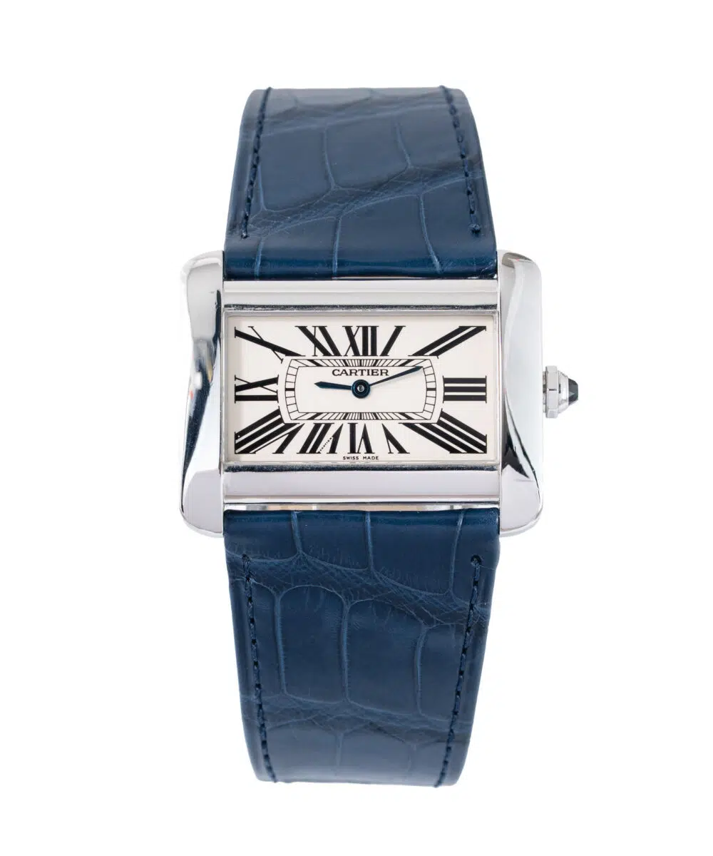 This Cartier Tank Divan 2599 has a White dial and a Rubber strap.