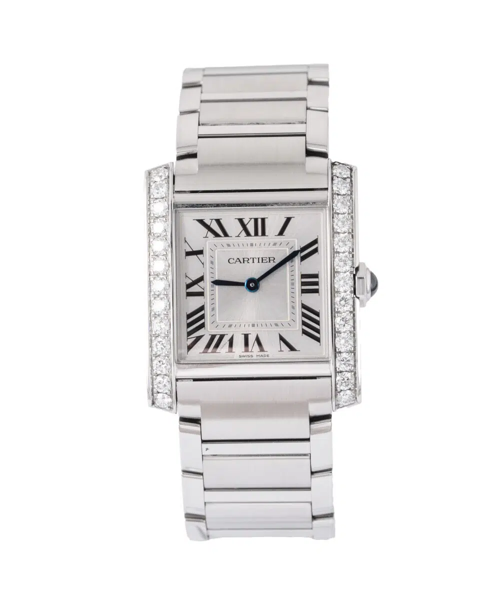 This Cartier Tank Francaise W4TA0021 has a Silver dial and a Bracelet strap.