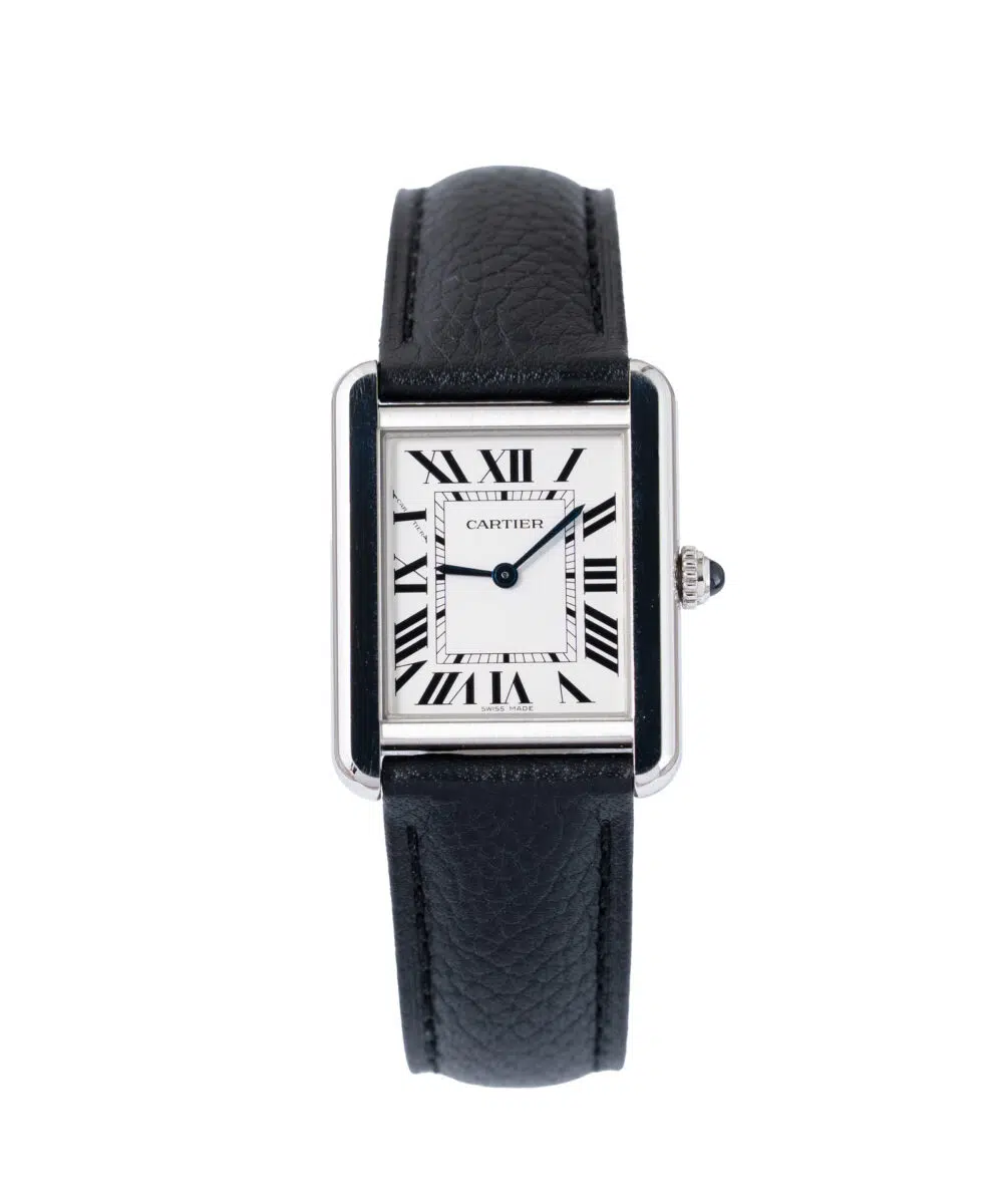 This Cartier Tank Solo WSTA0030 has a White dial and a Leather strap.