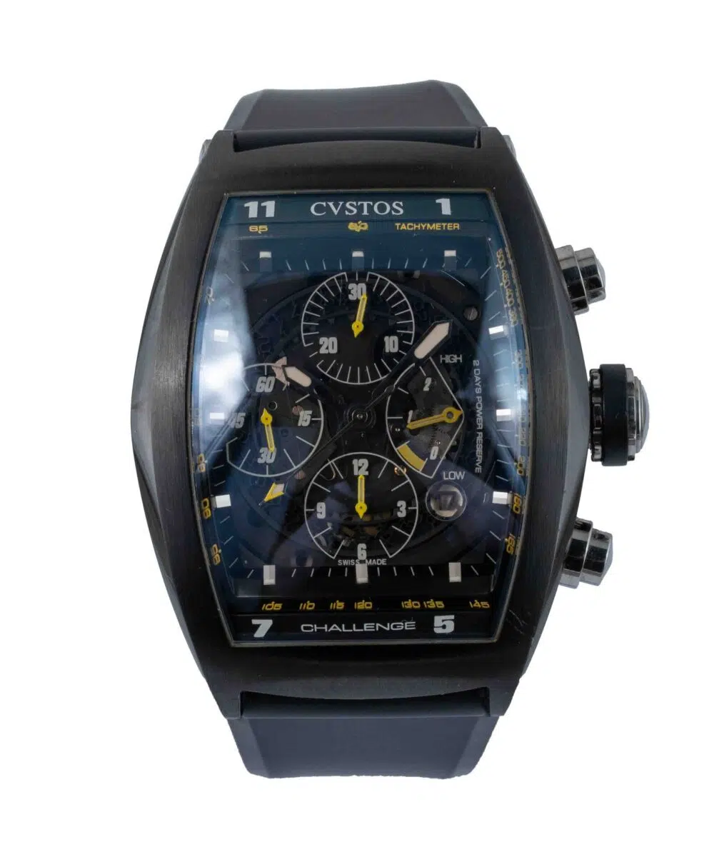 This CVSTOS Grand Prix Challenge Chronogrpah GENEVE 611 ST has a Black dial and a Rubber strap.