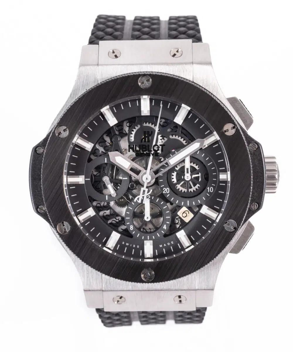 This Hublot Big Bang Aero Bang 311.SM.1170.GR has a Transparent dial and a Rubber strap.
