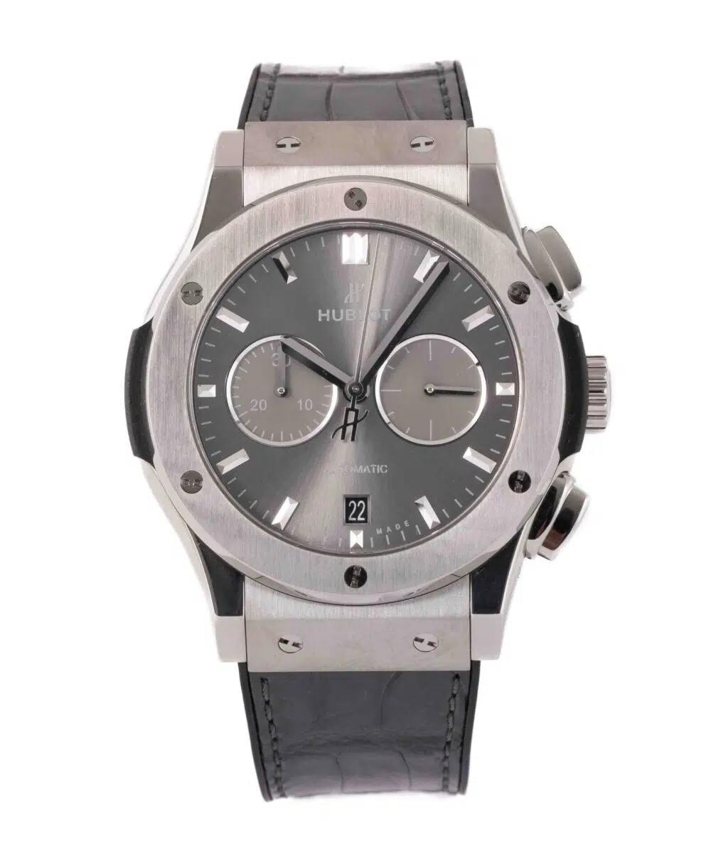 This Hublot Classic Fusion Chronograph 541.NX.7070.LR has a Rhodium dial and a Leather strap.