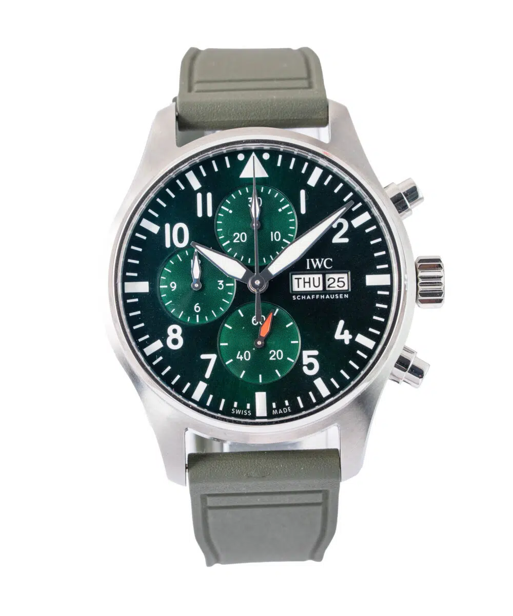 This IWC Pilot Chronograph IW378005 has a Green dial and a strap.