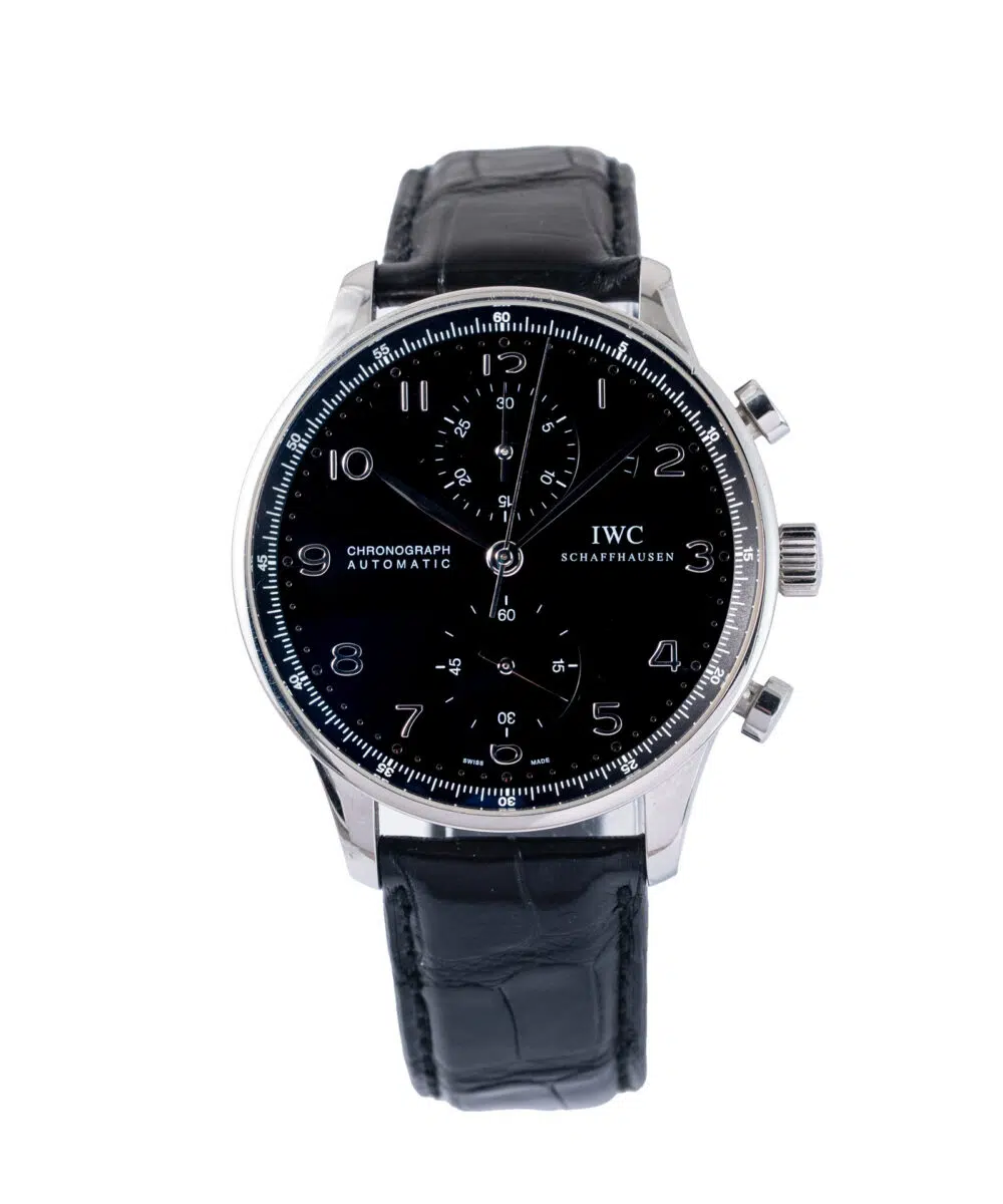 This IWC Portuguese Chronograph IW371438 has a Black dial and a Leather strap.