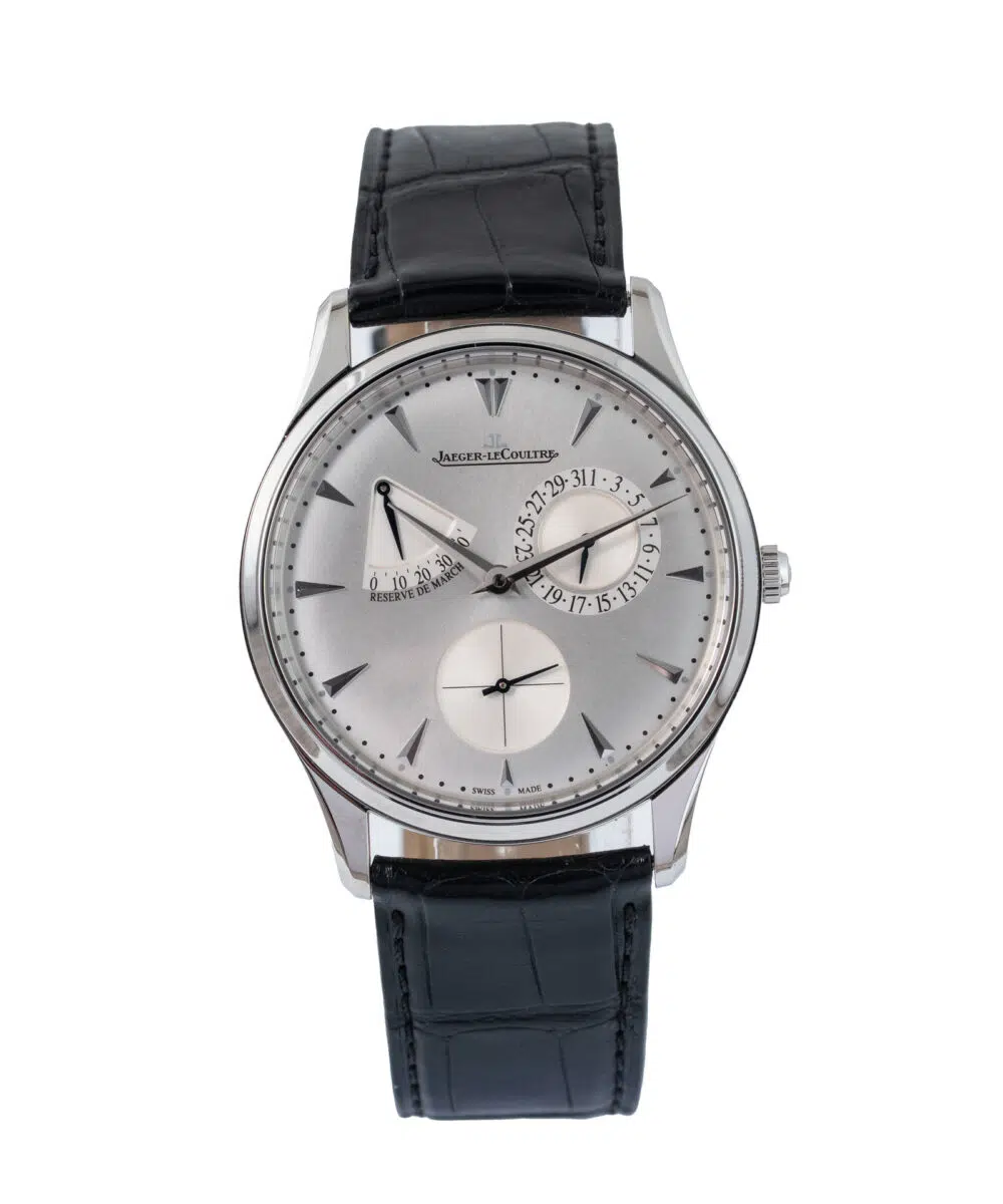 This Jaeger-LeCoultre Master Ultra Thin Réserve De Marche JLQ1378420 has a Silver dial and a Leather strap.
