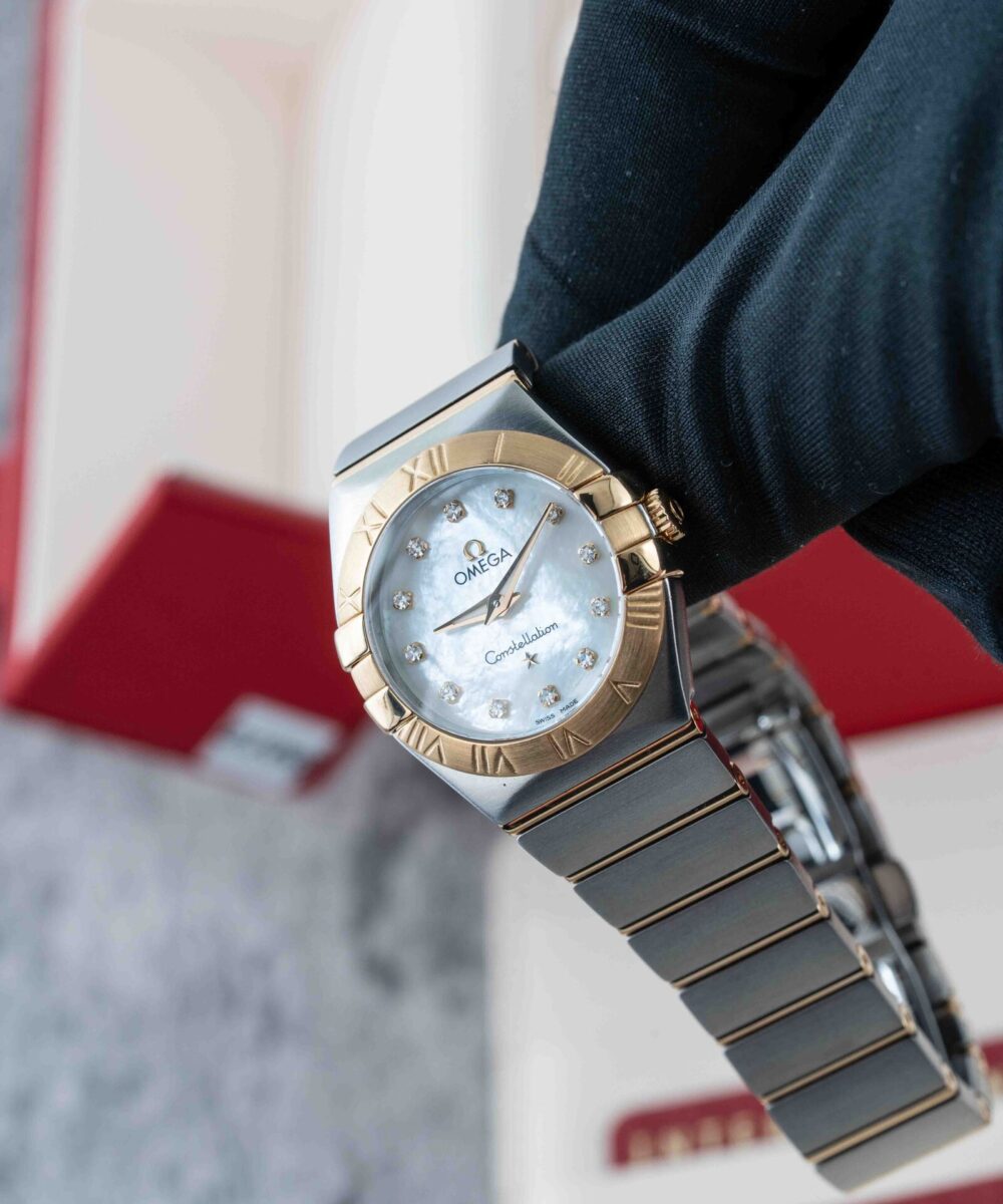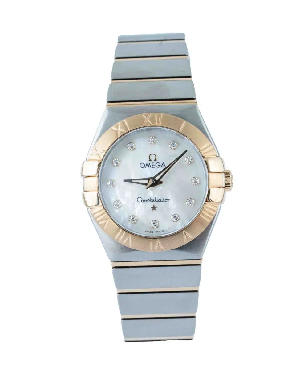 This Omega Constellation Quartz 123.20.27.60.55.002 has a Mother Of Pearl dial and a Bracelet strap.