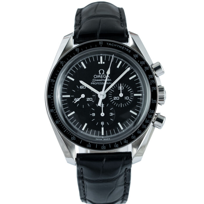 This Omega Dark Side Of The Moon Apollo 8 310.92.44.50.01.001 has a Black dial and a Leather strap.