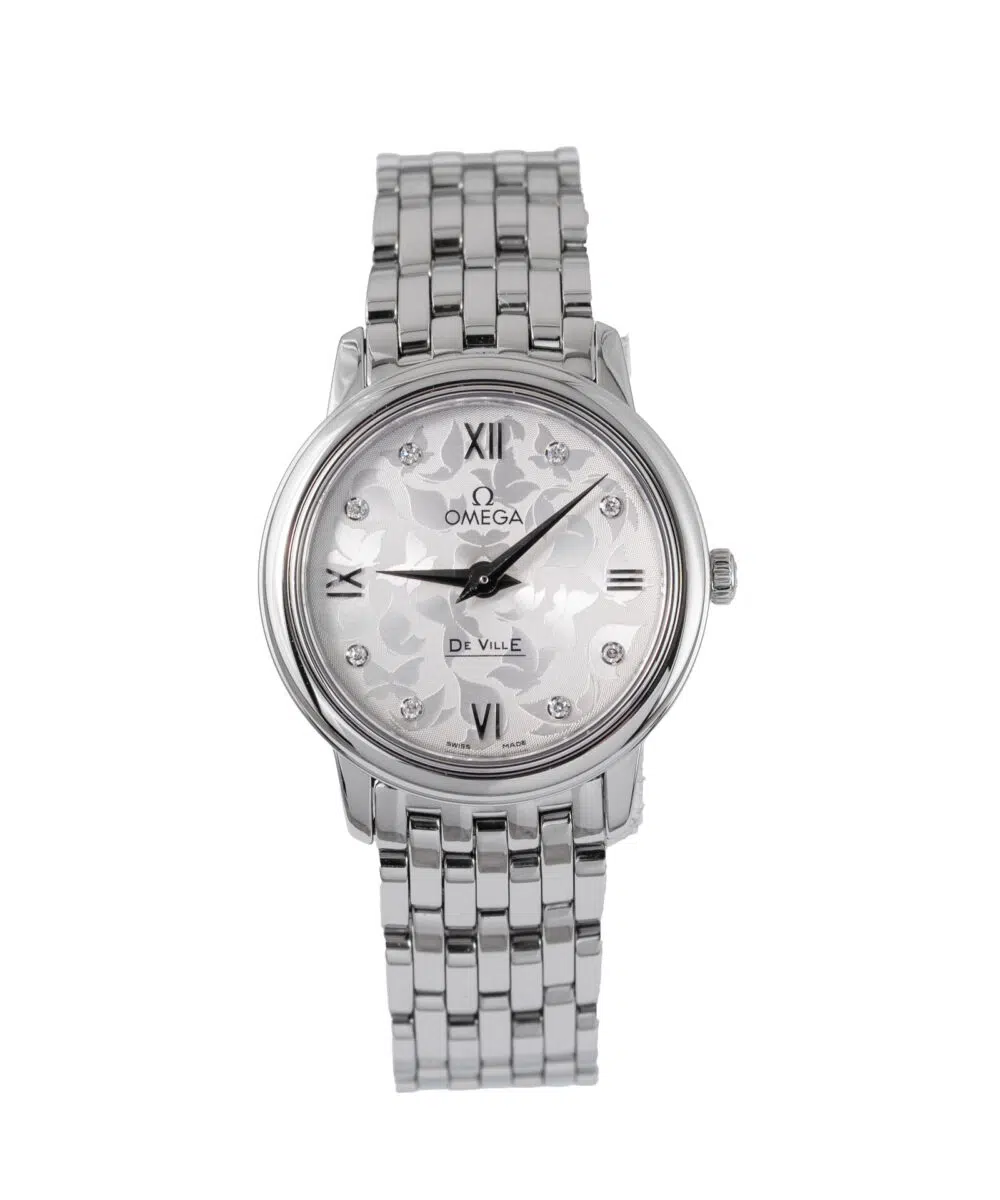 This Omega De Ville Prestige 424.10.27.60.52.001 has a Silver dial and a Bracelet strap.
