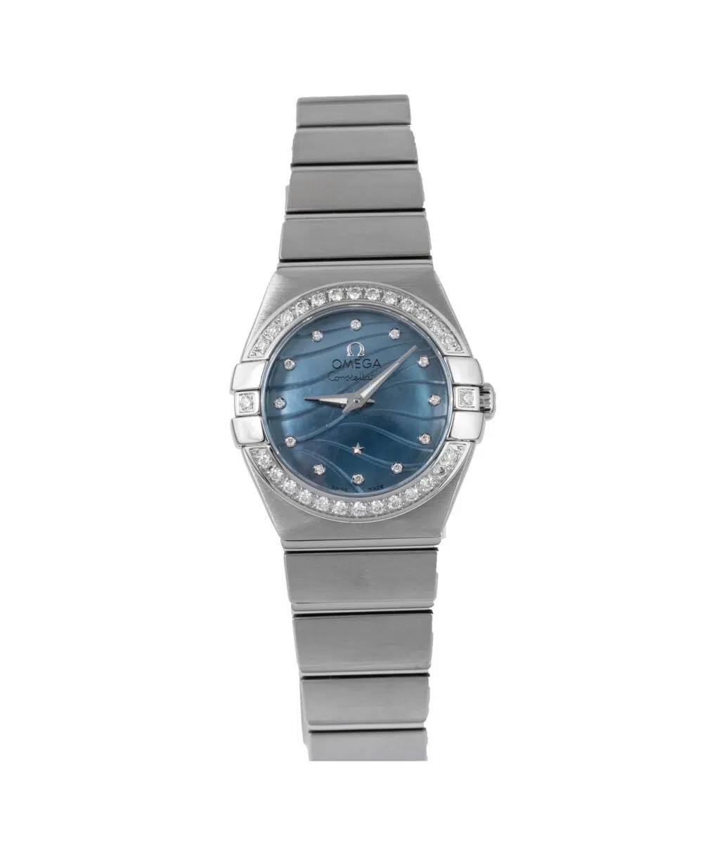 This Omega Ladies Constellation 123.15.24.60.57.001 has a Blue dial and a Bracelet strap.