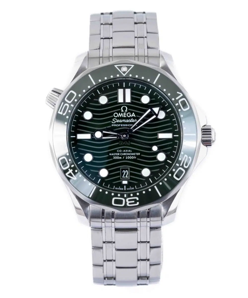 This Omega Seamaster 21030422010001 has a Green dial and a Bracelet strap.