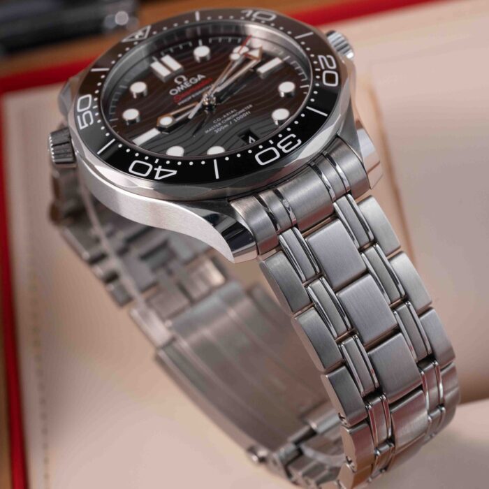 This Omega Seamaster 21030422001001 has a Black dial and a Bracelet strap.