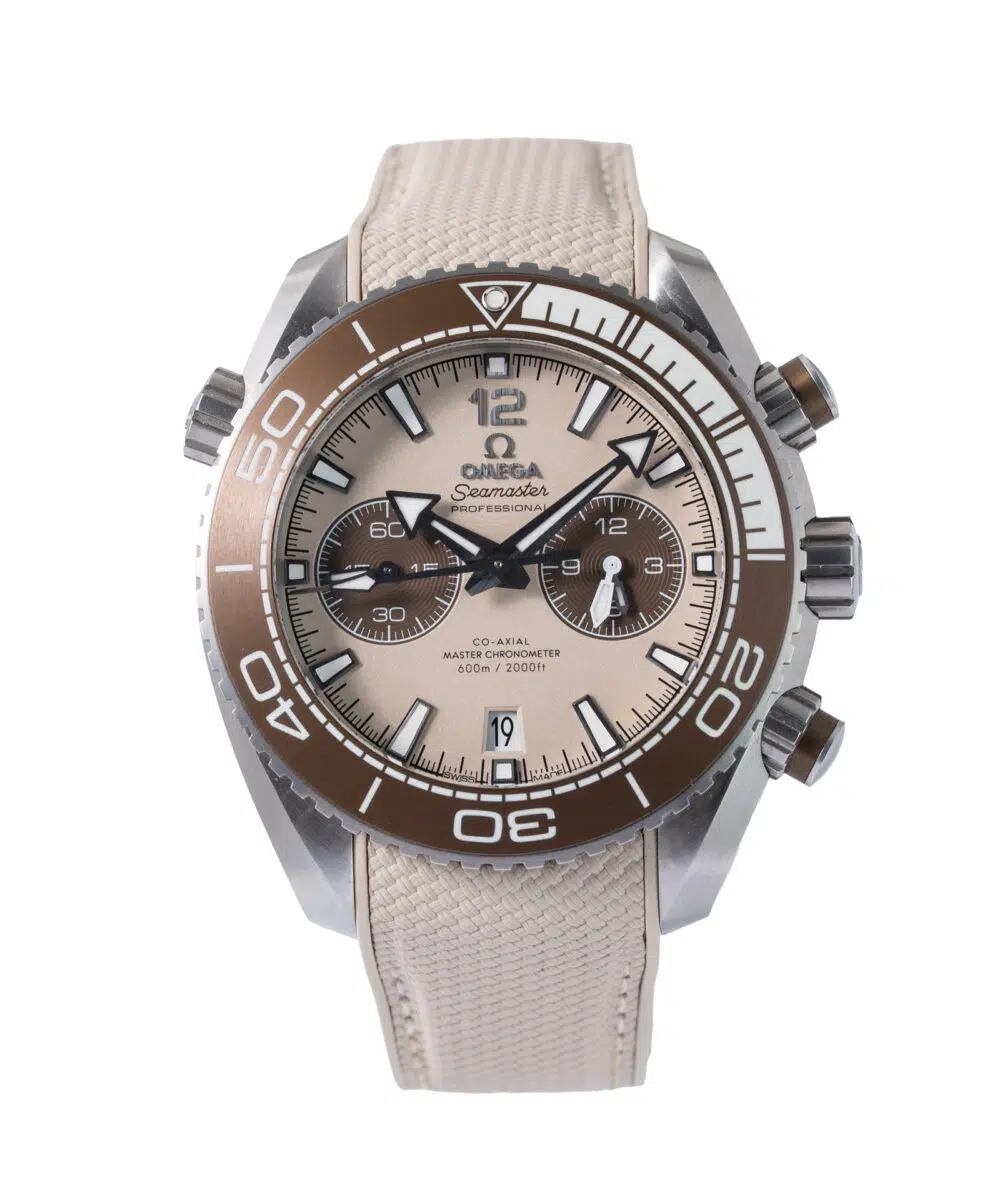 This Omega Seamaster Planet Ocean Chronograph 215.32.46.51.09.001 has a Beige dial and a Rubber strap.