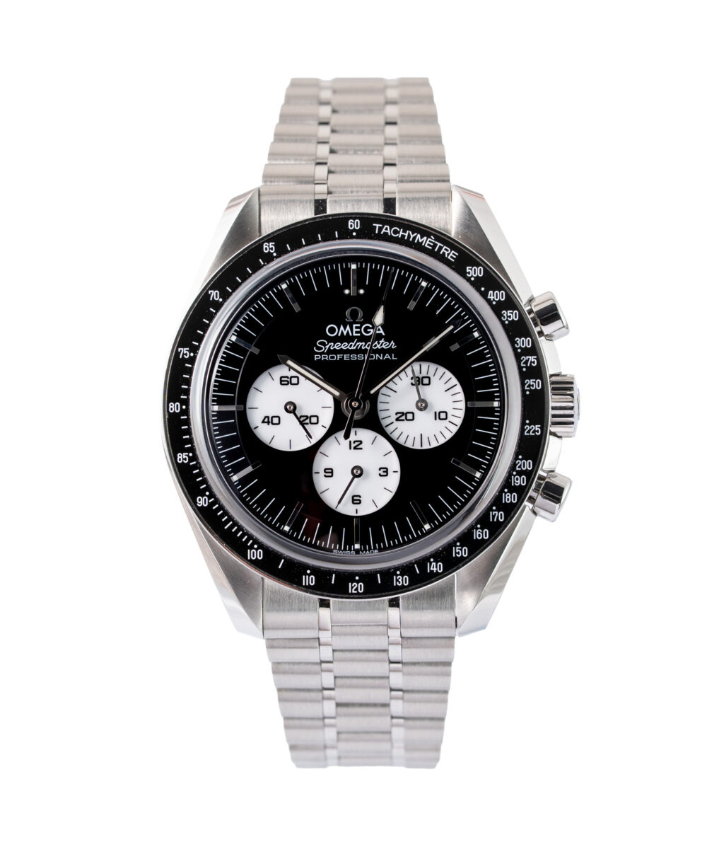 This Omega Speedmaster Professional Moonwatch 310.30.42.50.01.004 has a Black dial and a Bracelet strap.