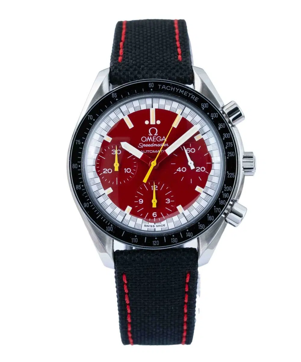 This Omega Speedmaster Schumacher 3810.61.41 has a Red dial and a Fabric strap.