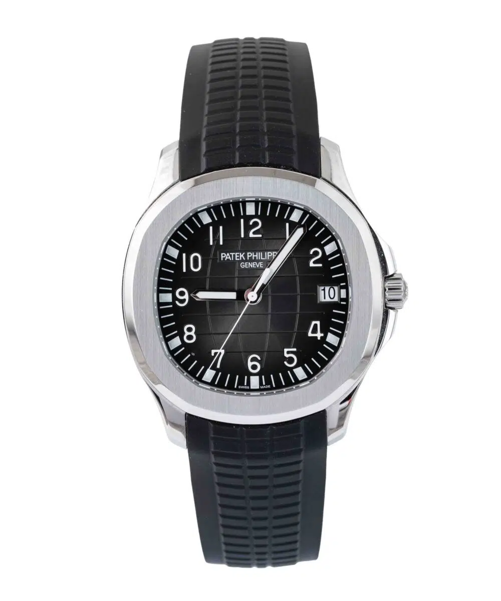 This Patek Philippe Aquanaut 5167A-001 has a Black dial and a Rubber strap.