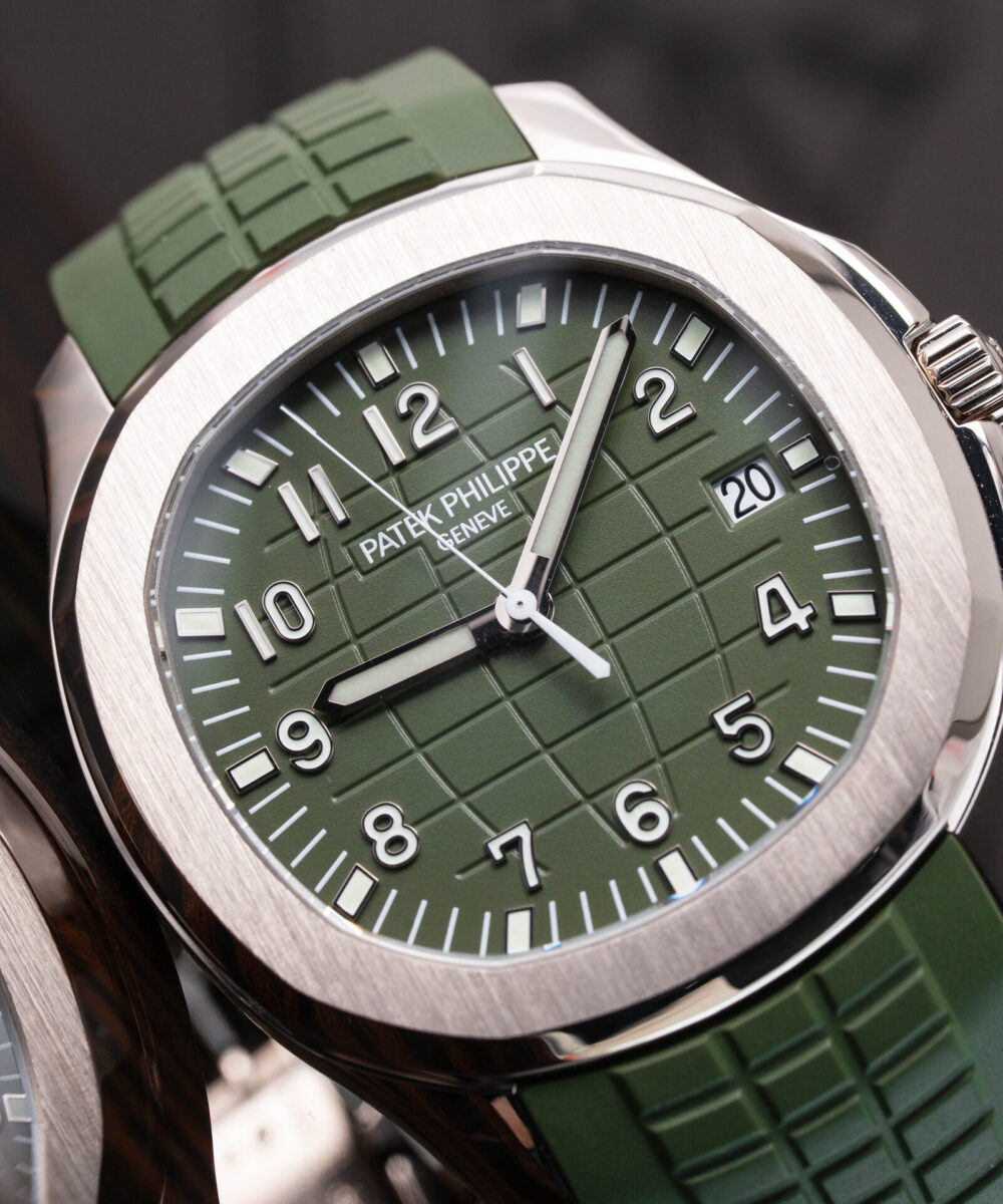 This Patek Philippe Aquanaut 5168G-010 has a Green dial and a Rubber strap.