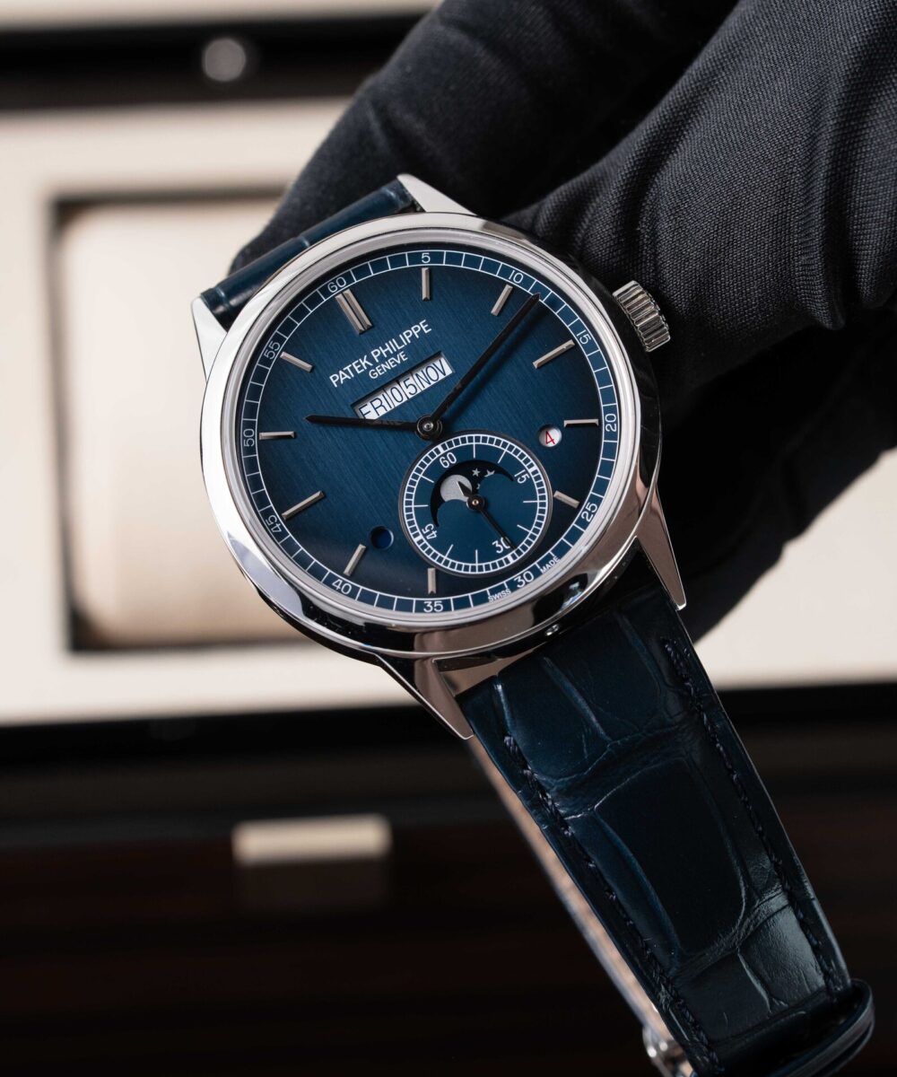 This Patek Philippe Perpetual Calendar 5236P-001 has a Blue dial and a Leather strap.