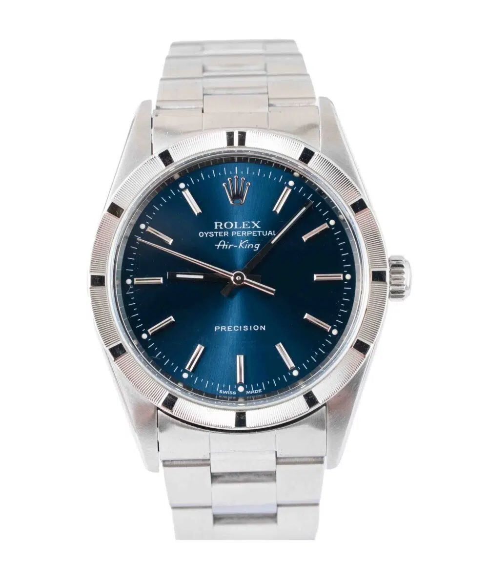 This Rolex Air-King 14010M has a Blue dial and a Bracelet strap.