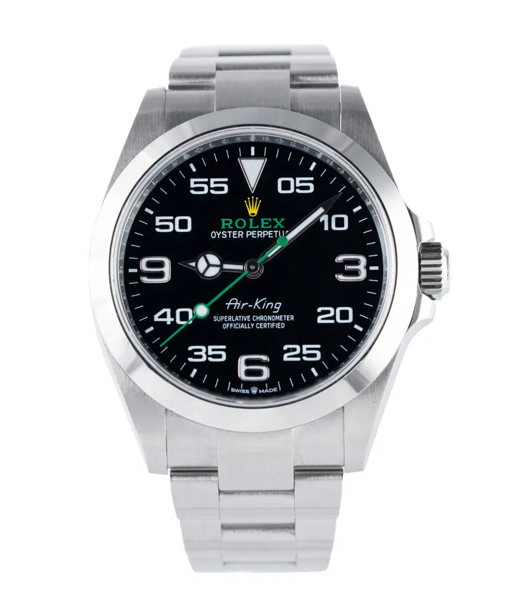 This Rolex Air-King 126900 has a Black dial and a Bracelet strap.