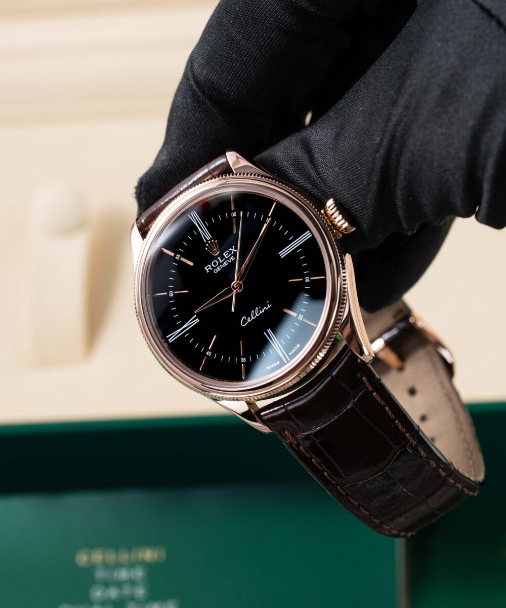 This Rolex Cellini 50505 has a Black dial and a Leather strap.