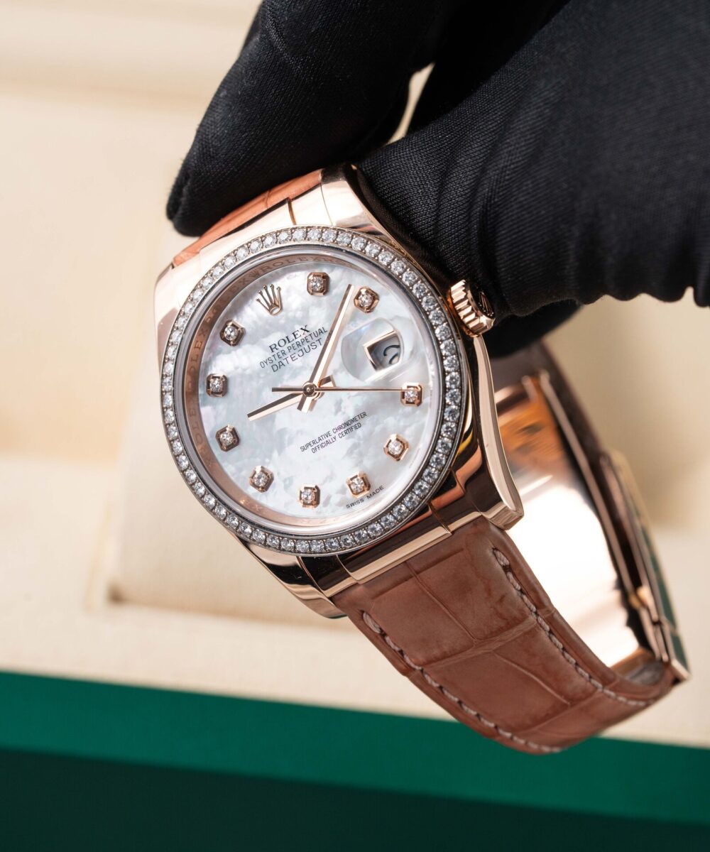 This Rolex Datejust 116185 has a Mother Of Pearl dial and a Leather strap.