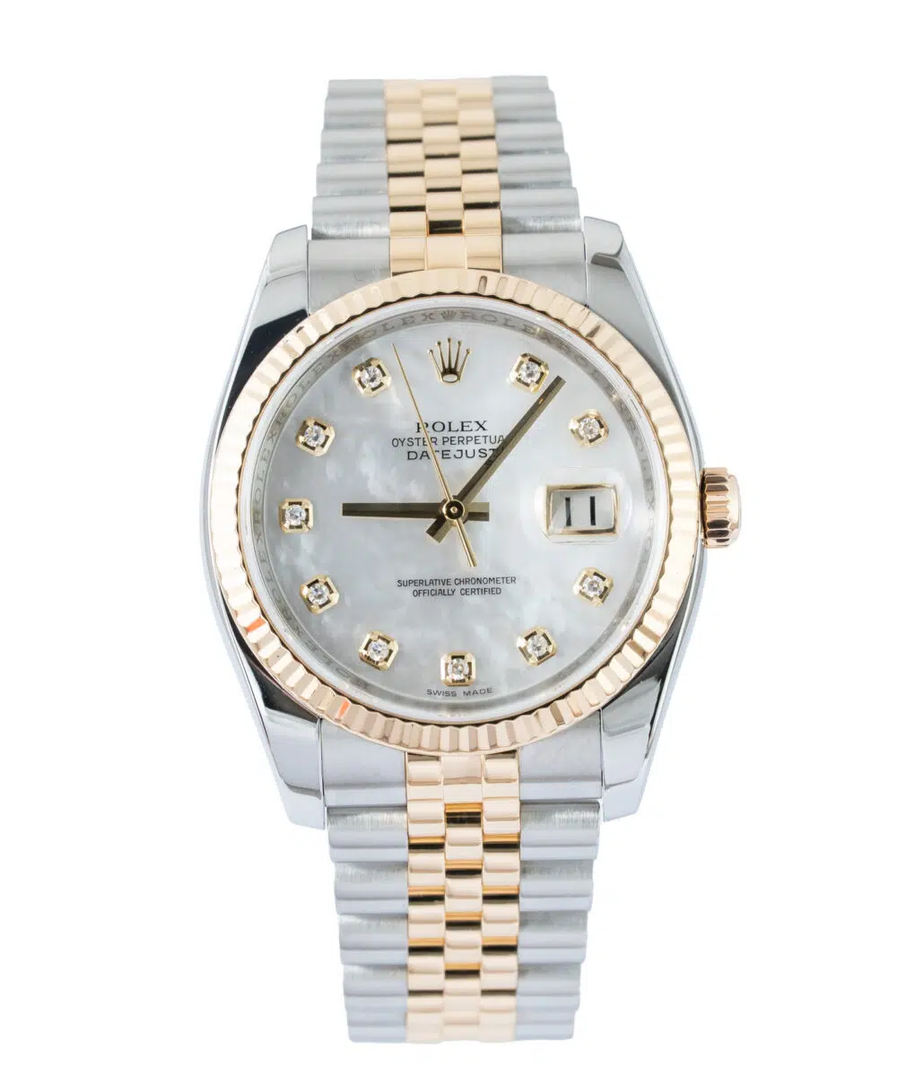 This Rolex Datejust 116233 has a Mother Of Pearl dial and a Bracelet strap.