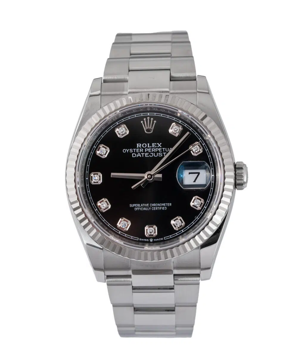 This Rolex Datejust 126234 has a Black dial and a Bracelet strap.