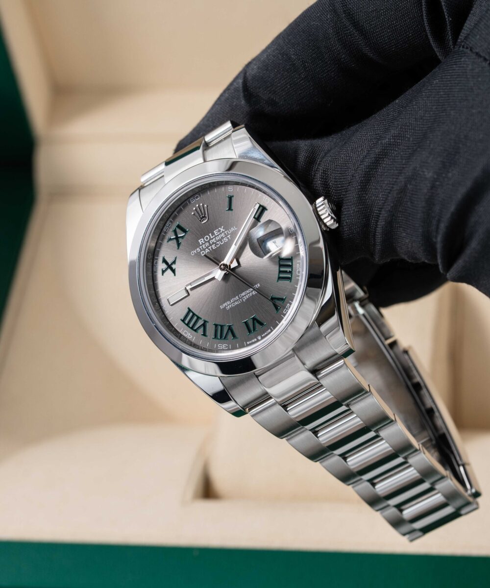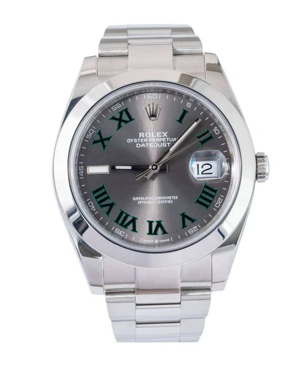 This Rolex Datejust 126300 has a Grey dial and a Bracelet strap.