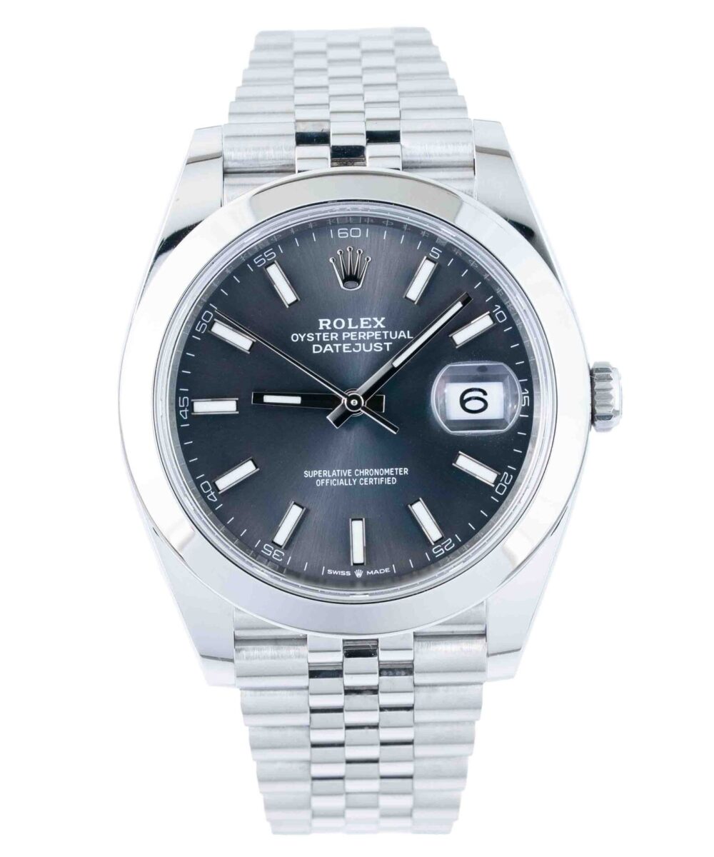 This Rolex Datejust 126300 has a Rhodium dial and a Bracelet strap.
