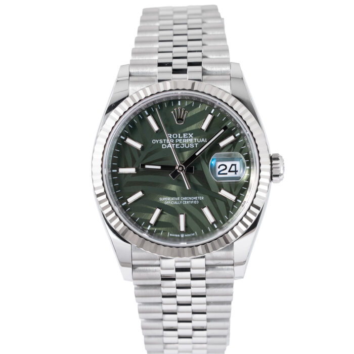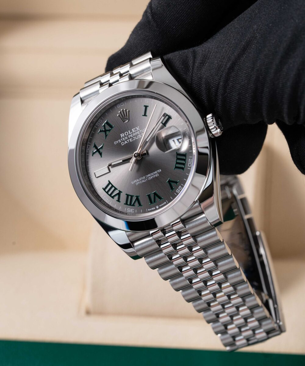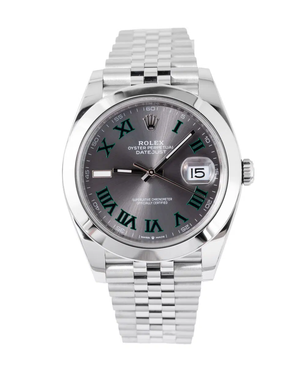 This Rolex Datejust 126300 has a Grey dial and a Bracelet strap.