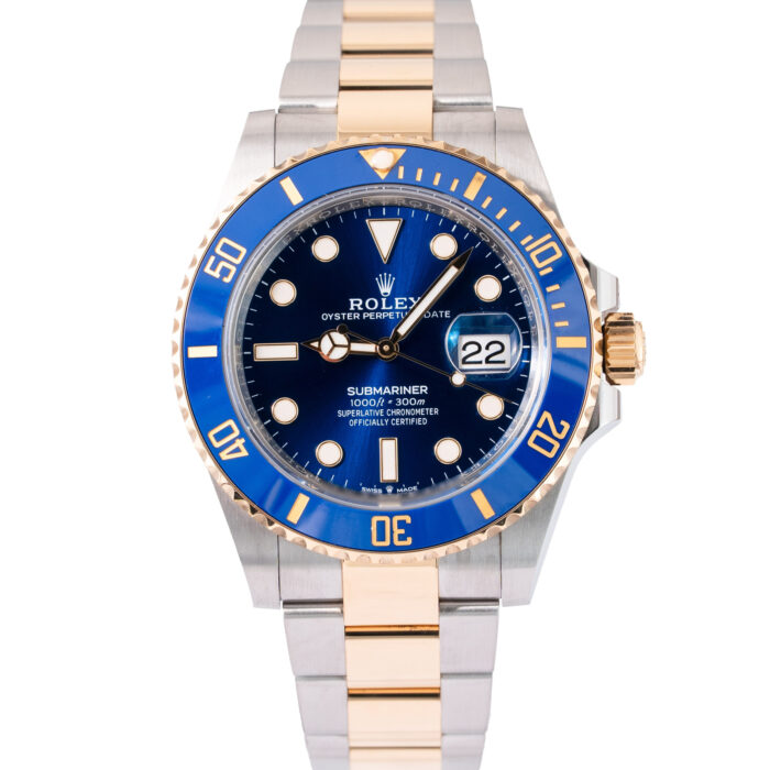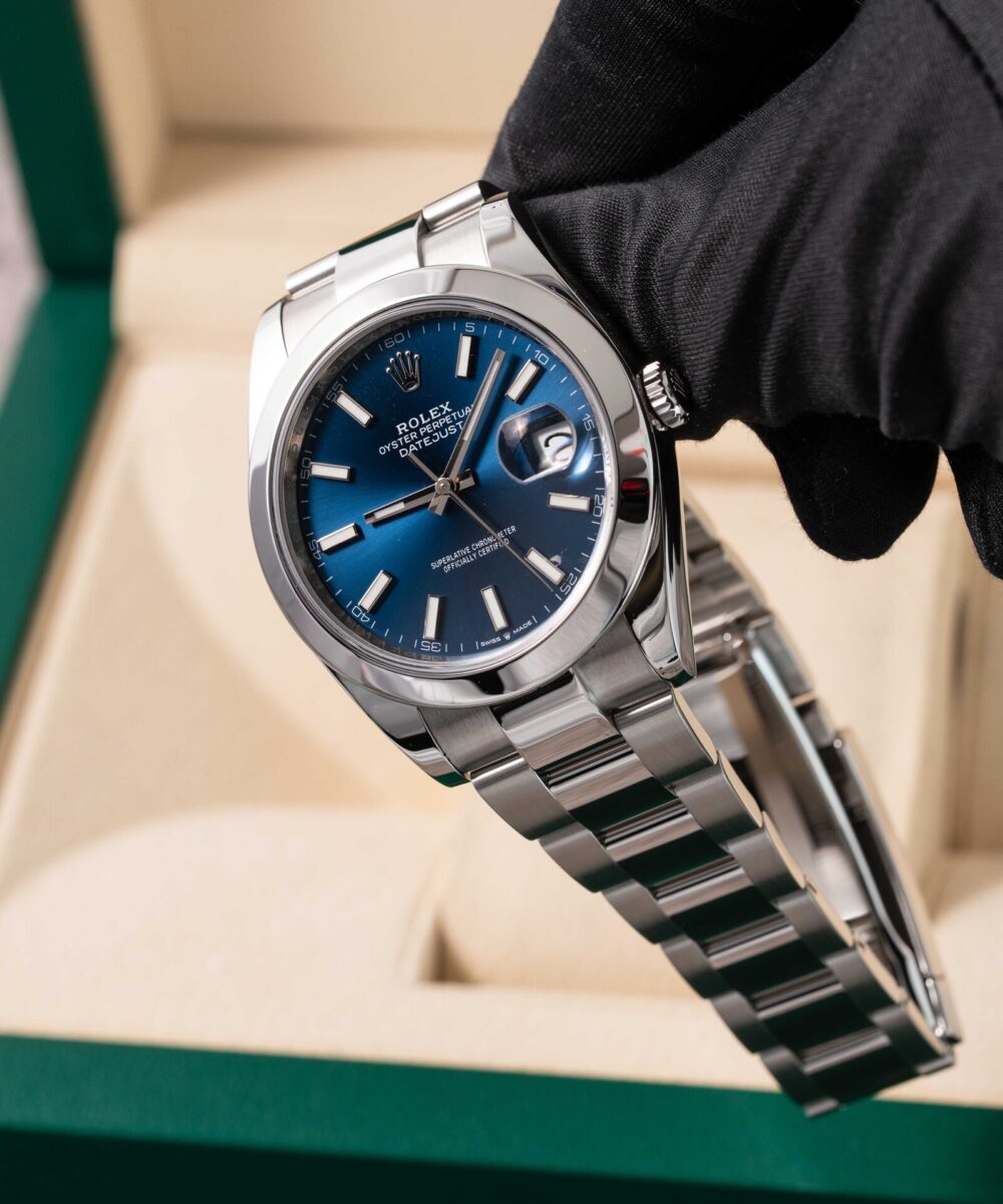 This Rolex Datejust 126300 has a Blue dial and a Bracelet strap.
