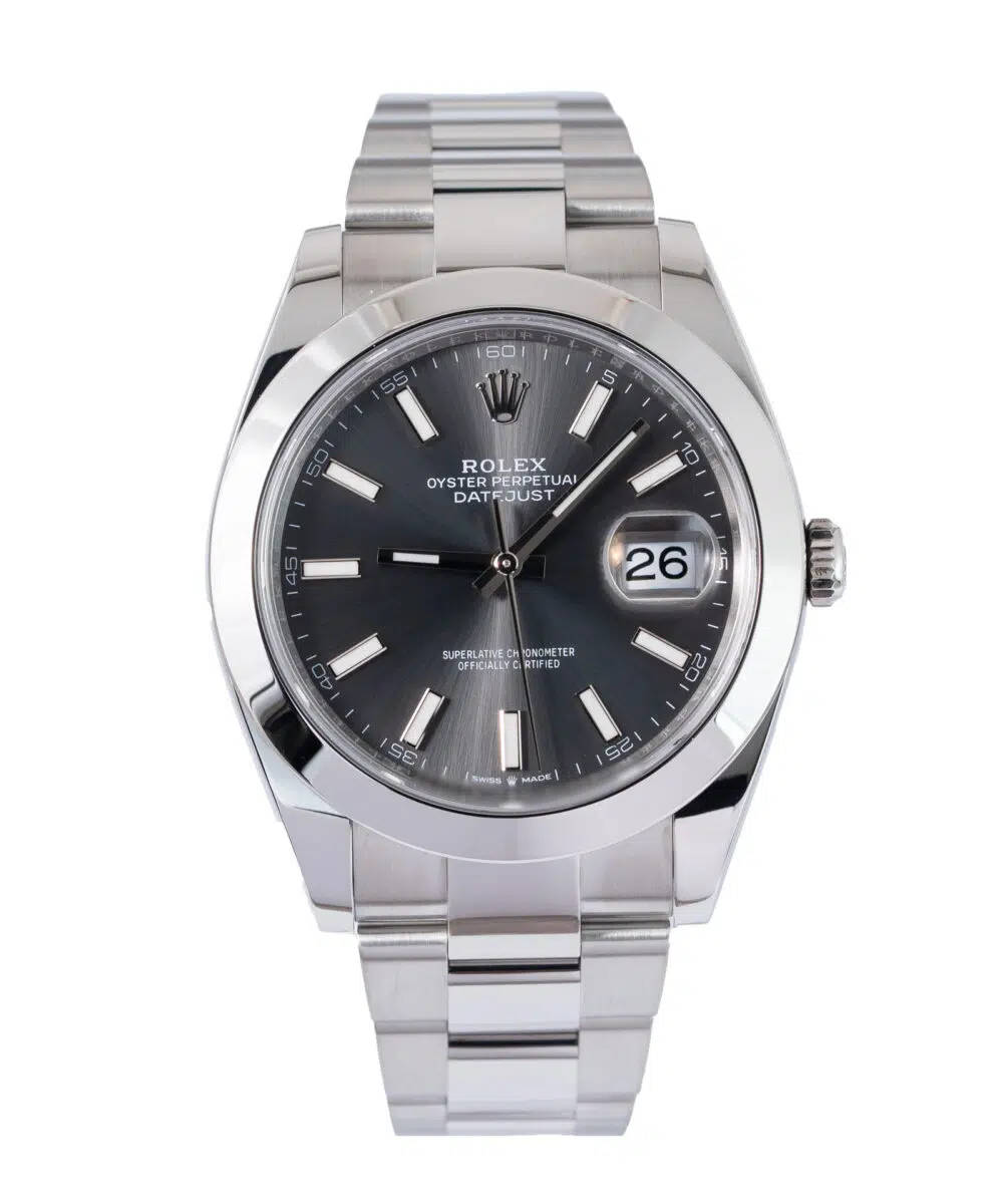 This Rolex Datejust 126300 has a Grey dial and a Bracelet strap.