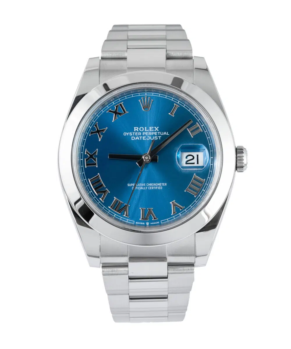 This Rolex Datejust 126300 has a Blue dial and a Bracelet strap.