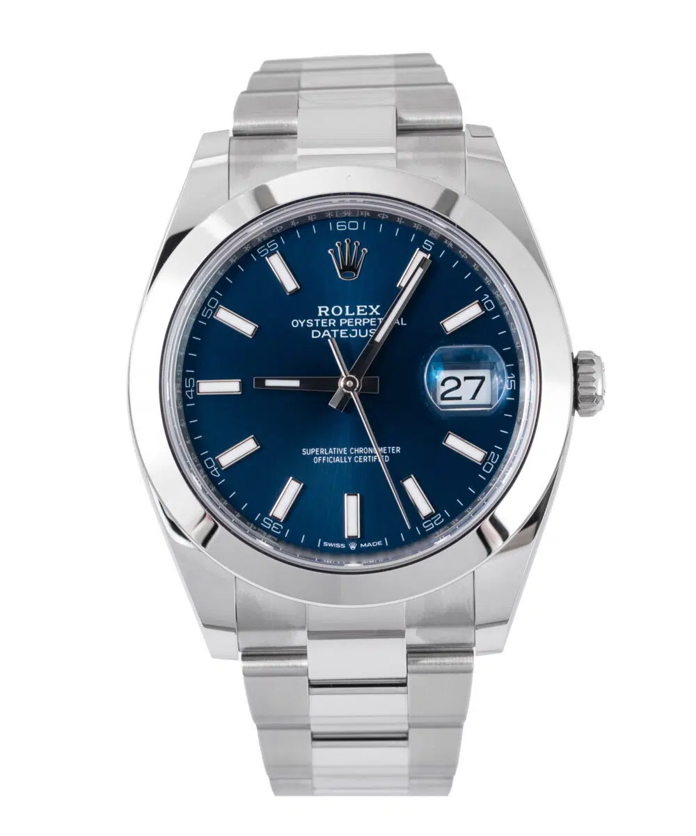 This Rolex Datejust 126300 has a Blue dial and a Bracelet strap.
