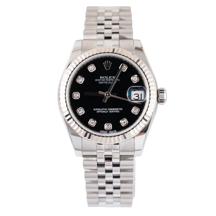 This Rolex Datejust 126334 has a Black dial and a Bracelet strap.