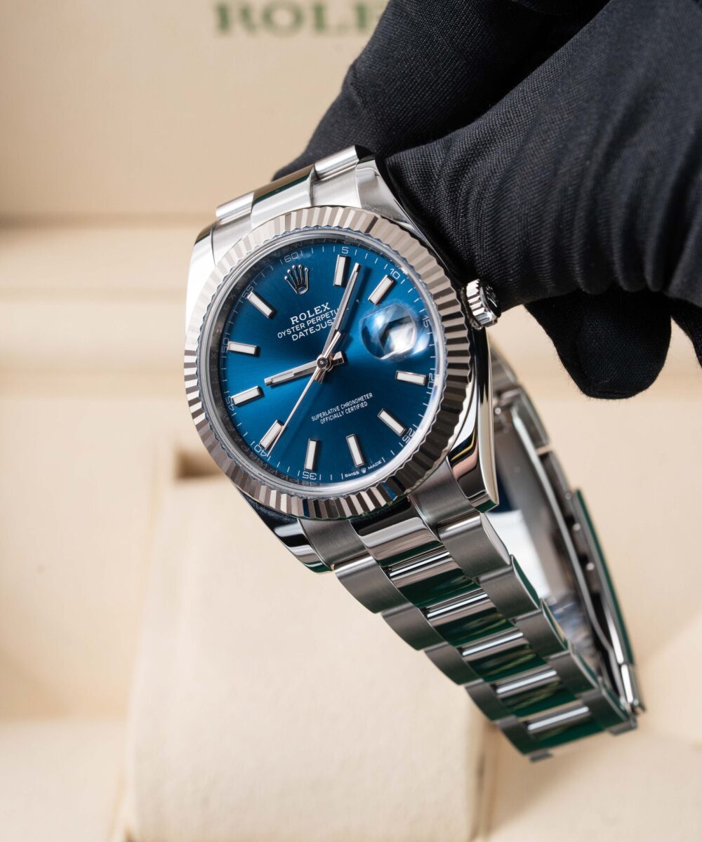 This Rolex Datejust 126334 has a Blue dial and a Bracelet strap.