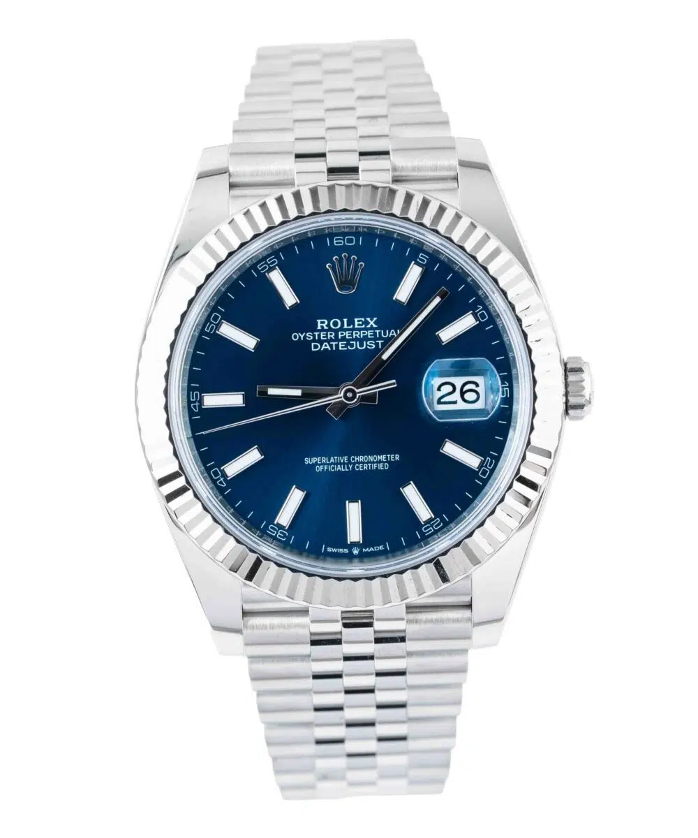 This Rolex Datejust 126334 has a Blue dial and a Bracelet strap.