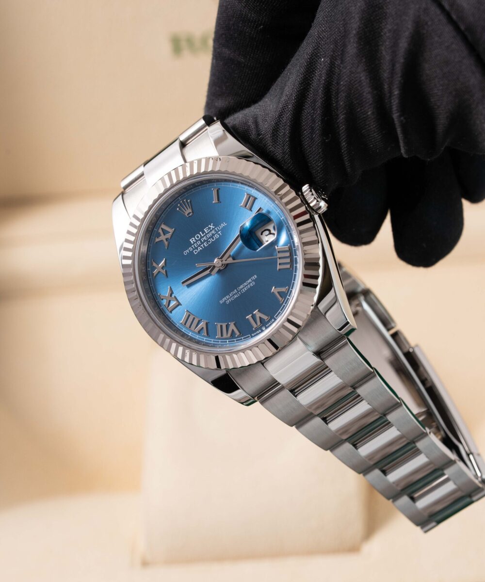 This Rolex Datejust 126334 has a Blue dial and a Bracelet strap.