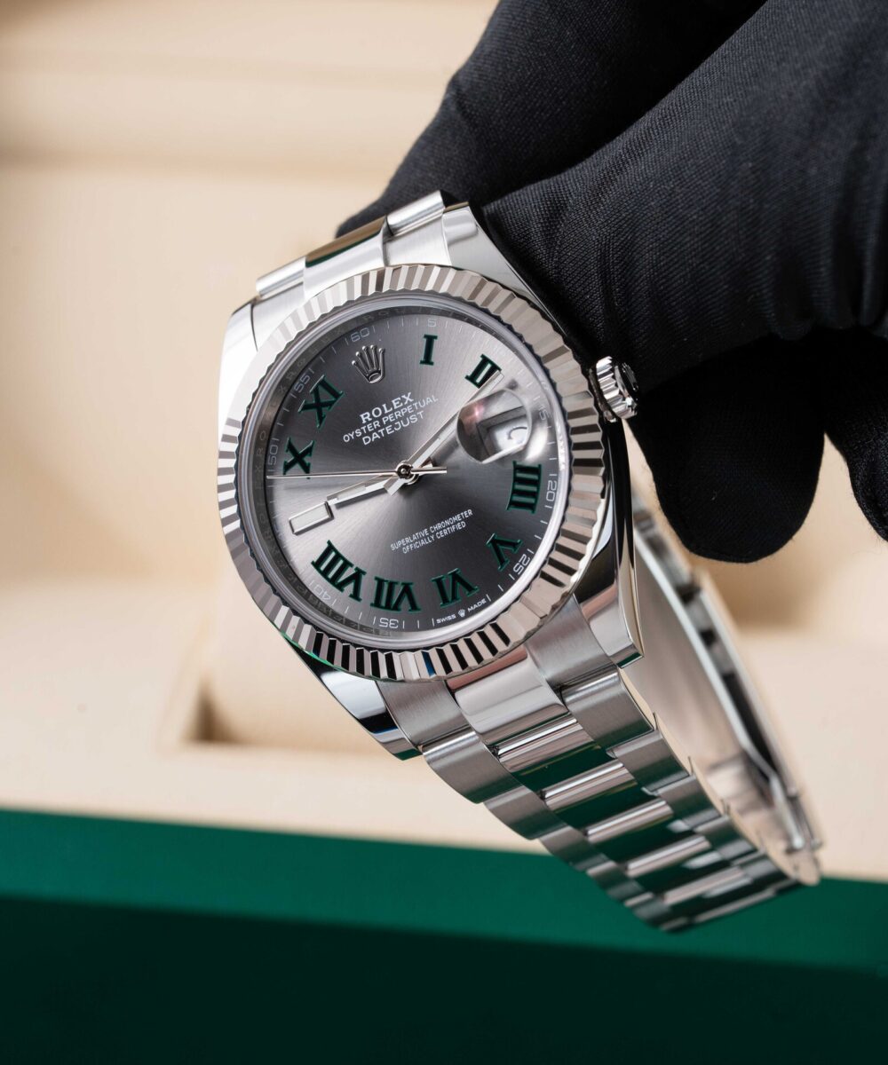 This Rolex Datejust 126334 has a Grey dial and a Bracelet strap.