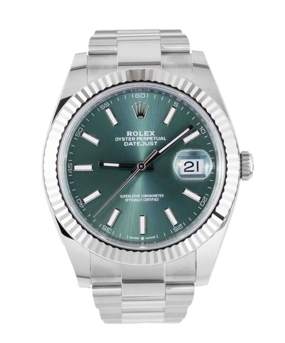 This Rolex Datejust 126334 has a Green dial and a Bracelet strap.