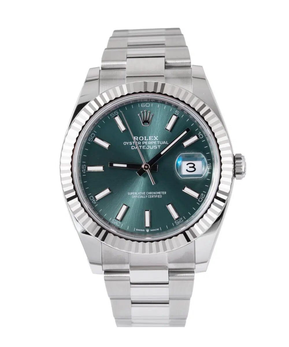 This Rolex Datejust 126334 has a Green dial and a Bracelet strap.