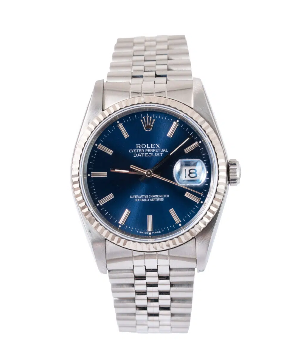 This Rolex Datejust 16234 has a Blue dial and a Bracelet strap.