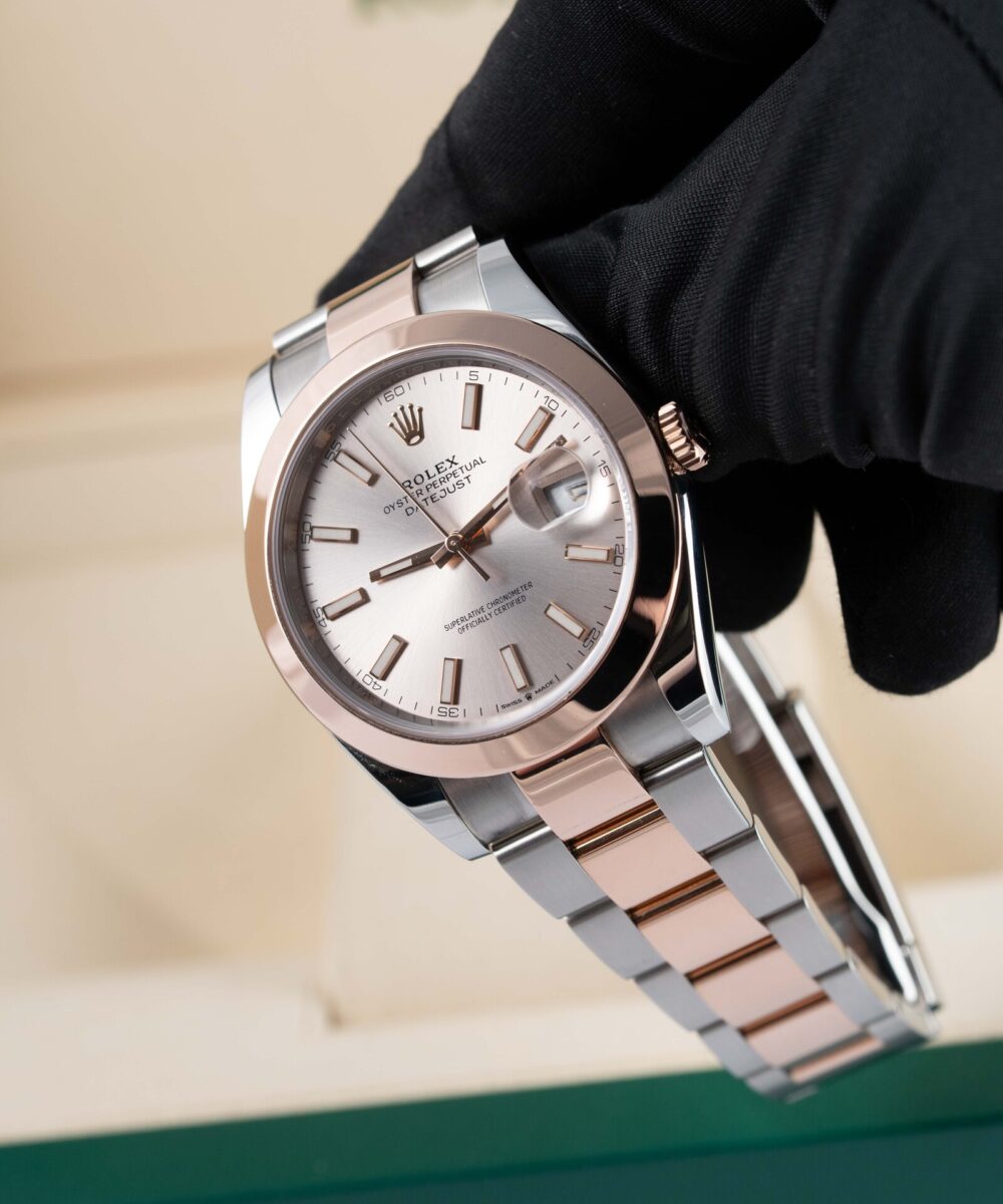 This Rolex Datejust 126301 has a Pink dial and a Oyster strap.