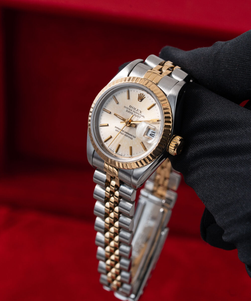 This Rolex Datejust 69173 has a Silver dial and a Bracelet strap.