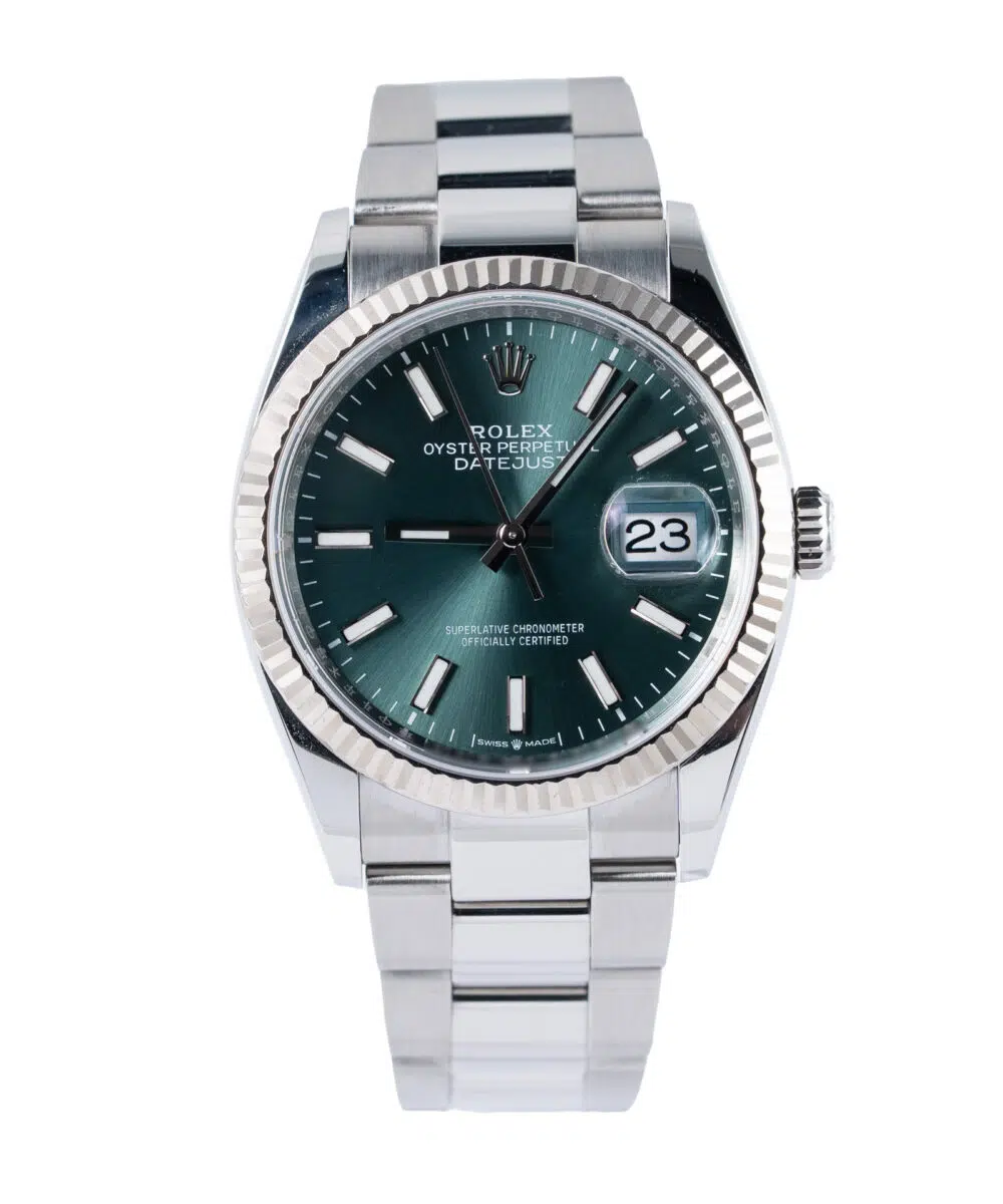 This Rolex Datejust 126234 has a Green dial and a Bracelet strap.